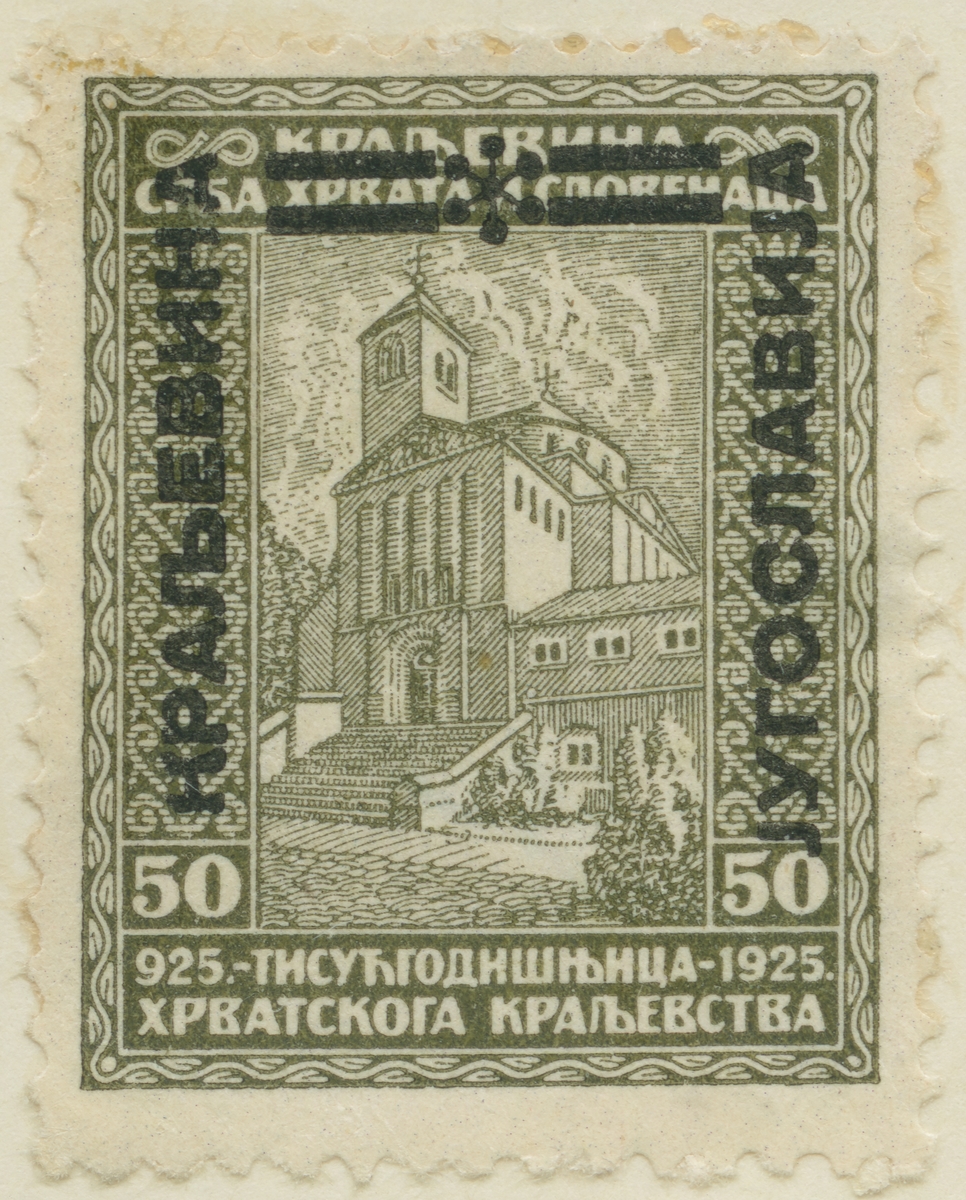 Frimärke från Jugoslavien, 1931. Motiv av Basilikan Dovanjsko Polje i Duvano. "Märke av 1929: Kroatiska kungariket 1000 år: 925-1925. Med 1931 svarta överstämpel: Kraljevina Jugoslavia (Konungariket Jugoslavia)".