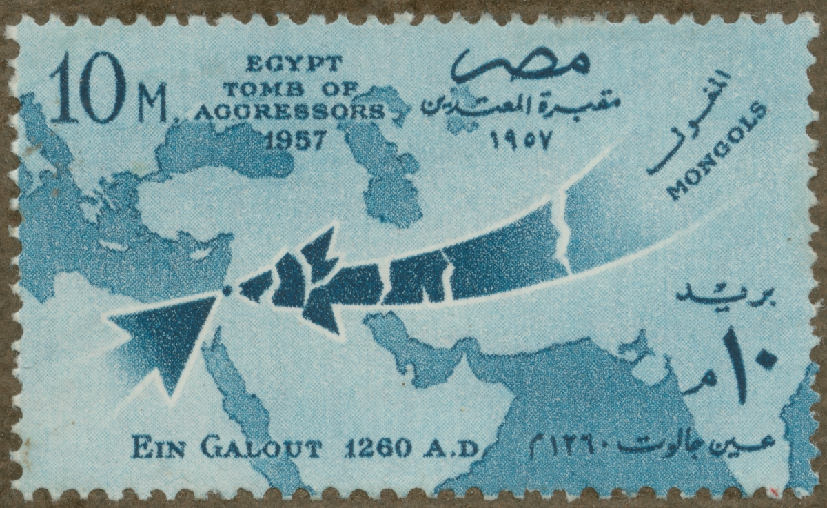 Frimärke från Egypten, 1957. Motiv av karta över Främre Orienten. "Visande Mongolfolkets invasionsrute. Pilar markerar Ain-Jalut (Ein Galut) var Egypten besegrade Mongoliet år 1260 i Palestina. Inskrifter: Egypt. "Tomb of Aggressors 1957" och "Ein Galout 1260".
