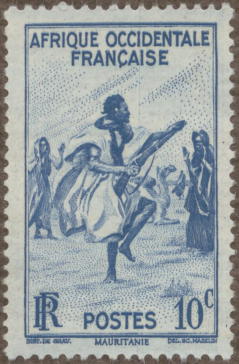 Frimärke från Franska Västafrika, 1947. Motiv av Gevärsdans i Trarza distriktet i Mauretanien