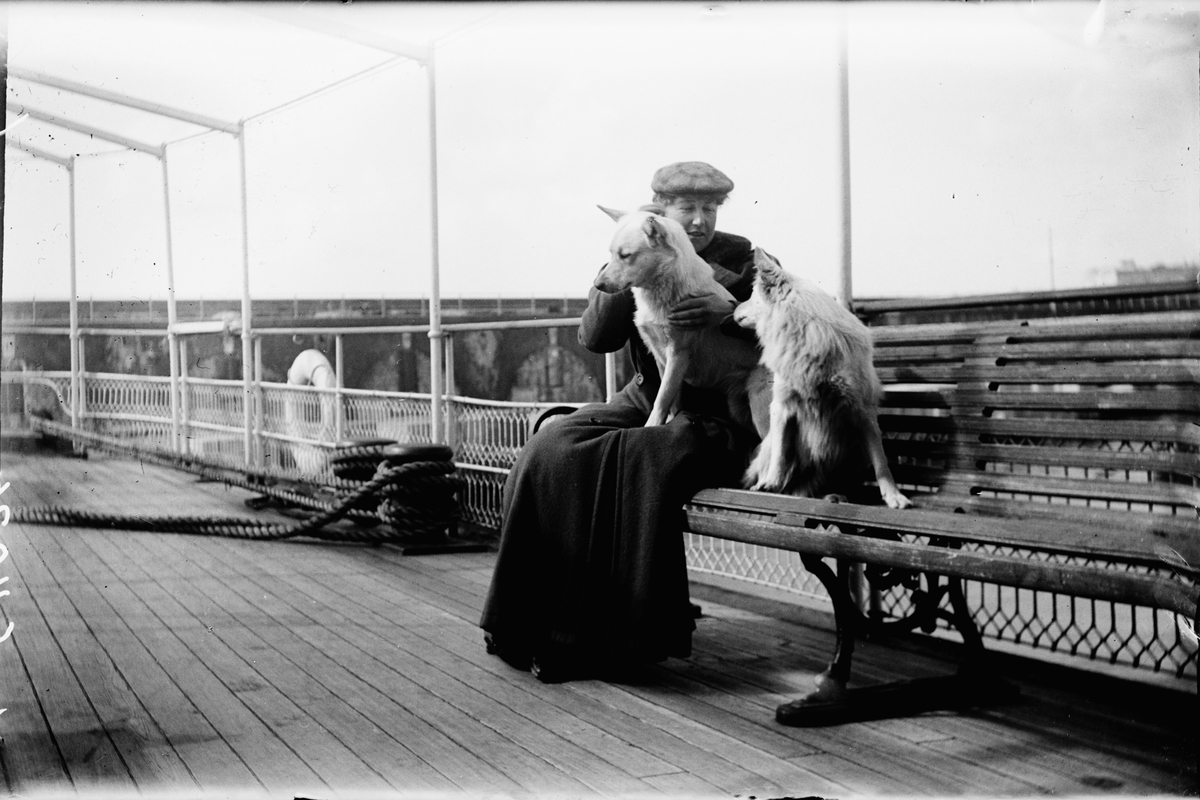 Drottning Victorias bilder. Kvinna sittande på båt med två hundar.
