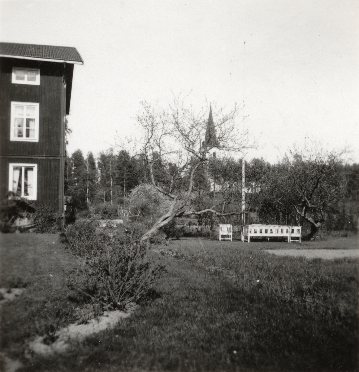 Utsikt från prästgården mot Mo kyrka. Prästgården var tidigare verkstadsbyggnad vid Flors Linnefabrik, Hälsingland. I sluttningen nedanför kyrkan låg små jordstugor där linet bereddes och vävning ägde rum.