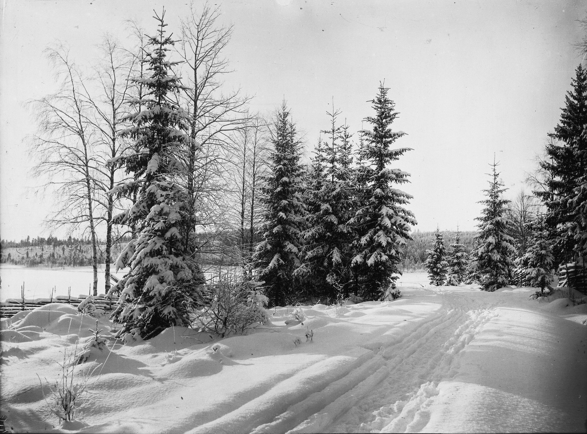 Diapositiv, fönsterbild av vinterlandskap, troligen i Hedemoratrakten.