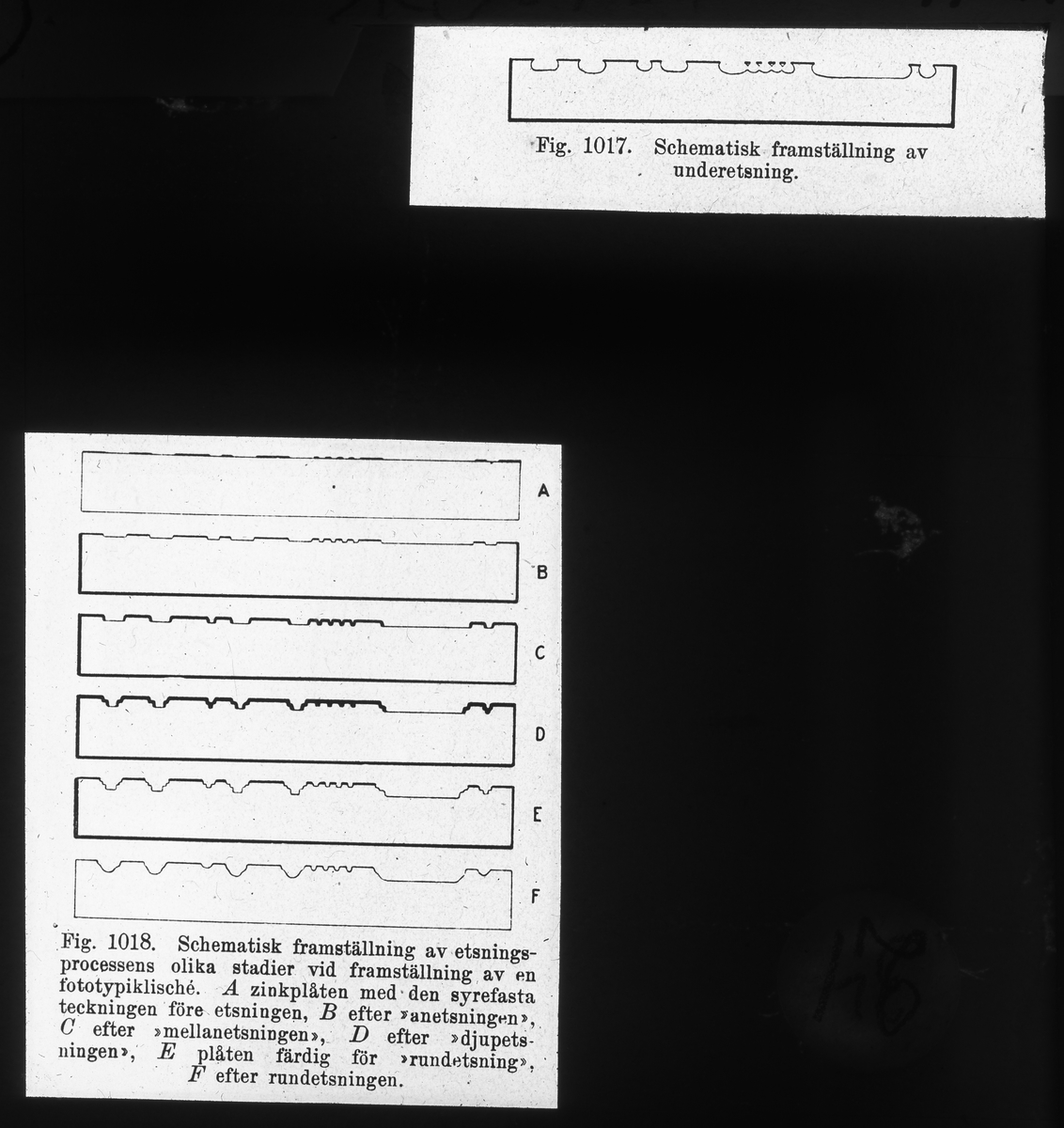 Scematisk framställning av etsningsprocessens olika stadier vid en fototypiklisché.