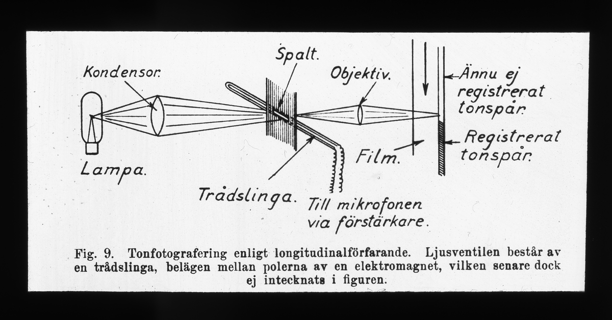 Tonfotografering enligt longitudinalförfarande. Ljusventilen består av en trådslinga, belägen mellan polerna av en elektromagnet, vilken senare dock ej intecknats i figuren.