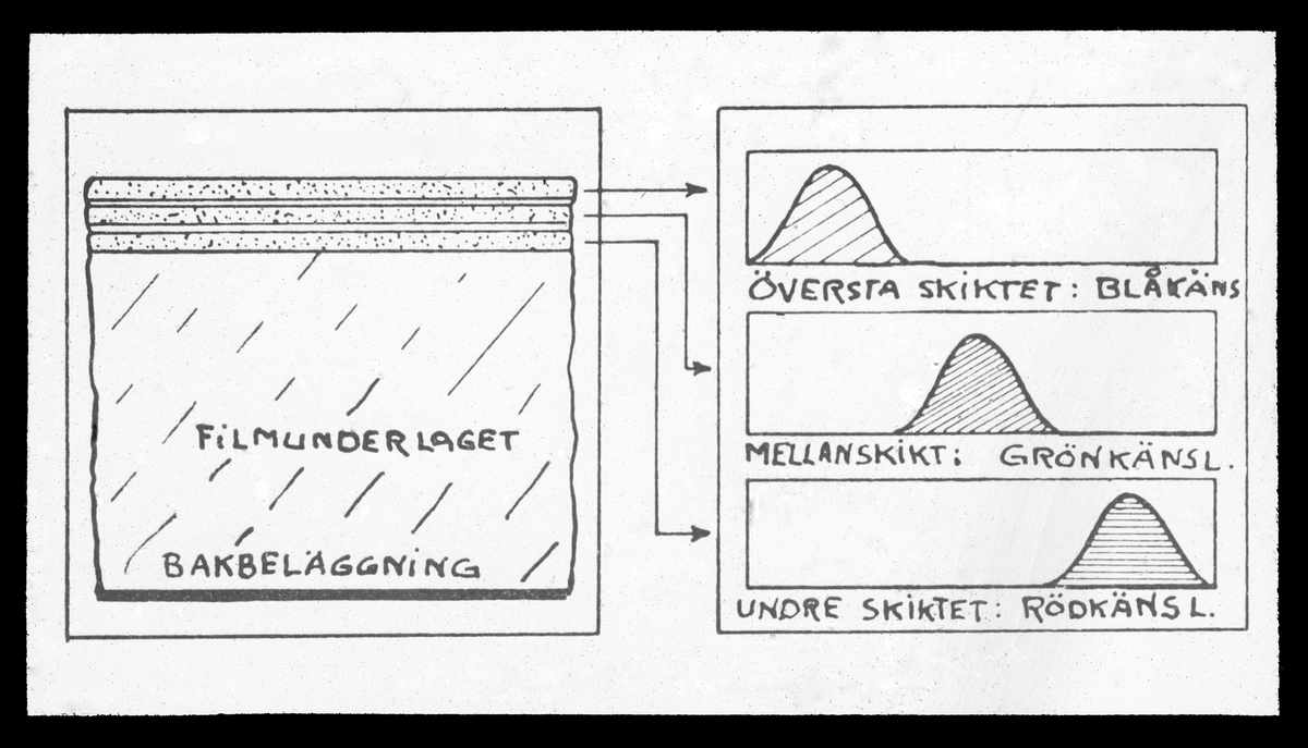 Skioptikonbild från institutionen för fotografi vid Kungliga Tekniska Högskolan. Använd av professor Helmer Bäckström som föreläsningsmaterial. Bäckström var Sveriges första professor i fotografi vid Kungliga Tekniska Högskolan 1948-58. Motiv föreställande "Treskiktsprincip" För mer info se: Bäckström, Helmer. Fotografisk Handbok. Andra omarbetade upplagan. Natur och Kultur. Stockholm. 1958-59. Kap. 131 s 981 och följande. "Direkta substraktiva metoder med material enligt treskiktsprincipen. Diapositivförfaranden."