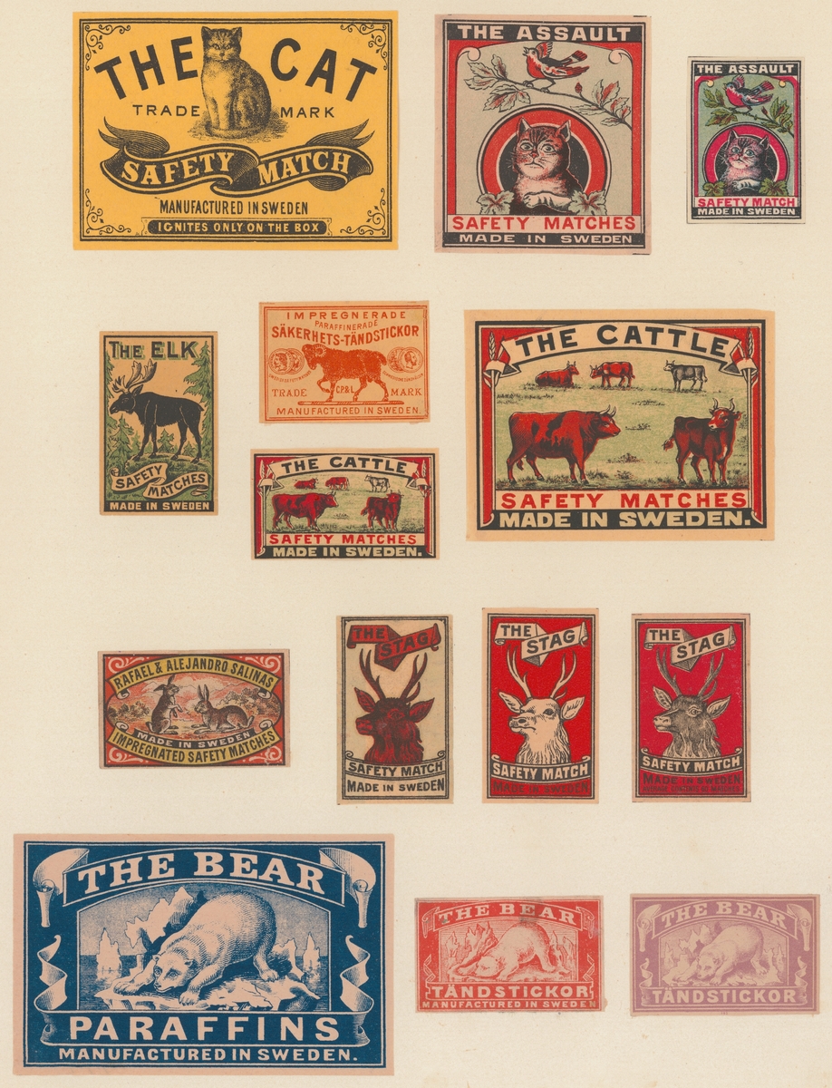 Etiketter för tändsticksaskar, från Svenskt Industri- och Handelsmuseum.