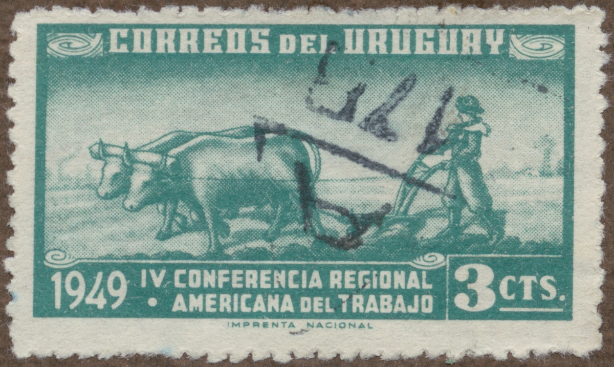 Frimärke från Uruguay, 1949, Motiv av Plöjning med oxar -Propaganda för IV Amerikanska Regionala Arbetskongressen: 1949-