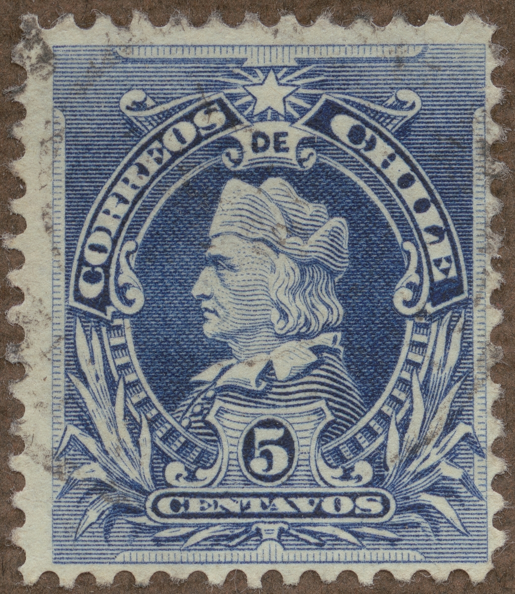 Frimärke från Chile, 1901. Motiv av Christopher Columbus (Cristobal Colón) 1446-1506 1492 första resan över Atlanten