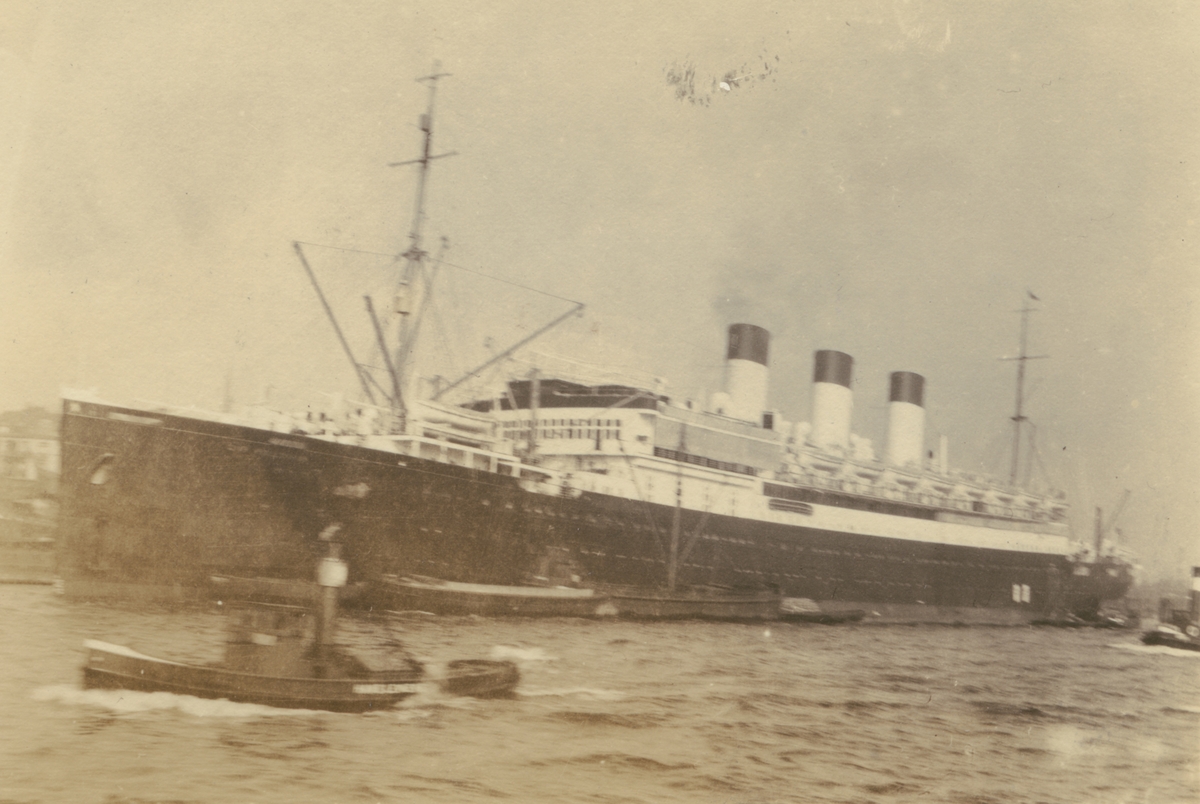 Fotografi från Albin Ahrenbergs resa till Grönland 1929. Motiv av stort fartyg på havet.