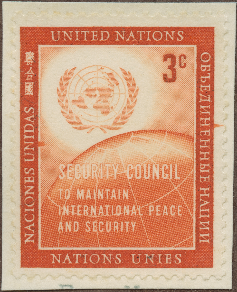 Frimärke från F.N. 1957. Motiv av Jordglob och F.N.-märket International Peace and Security