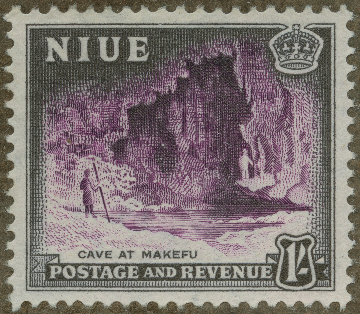 Frimärke ur Gösta Bodmans filatelistiska motivsamling, påbörjad 1950. Frimärke från Niue, 1950. Motiv av Grottan vid Makefu