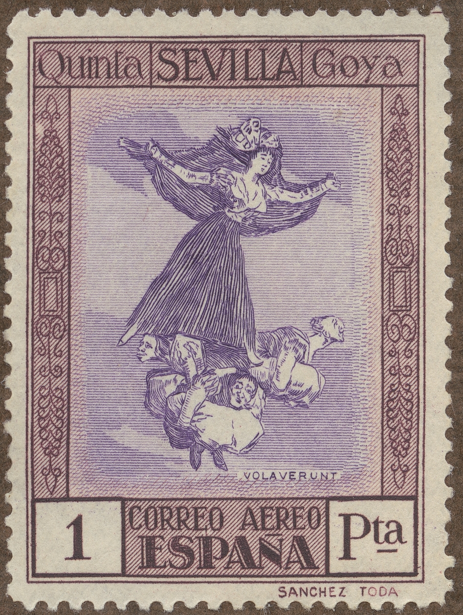 Frimärke från Spanien, 1930. Motiv av En kvinna buren av flygander "Målning av Goya. 1746-1828. 100-årminne av hans död. Goya Serie."