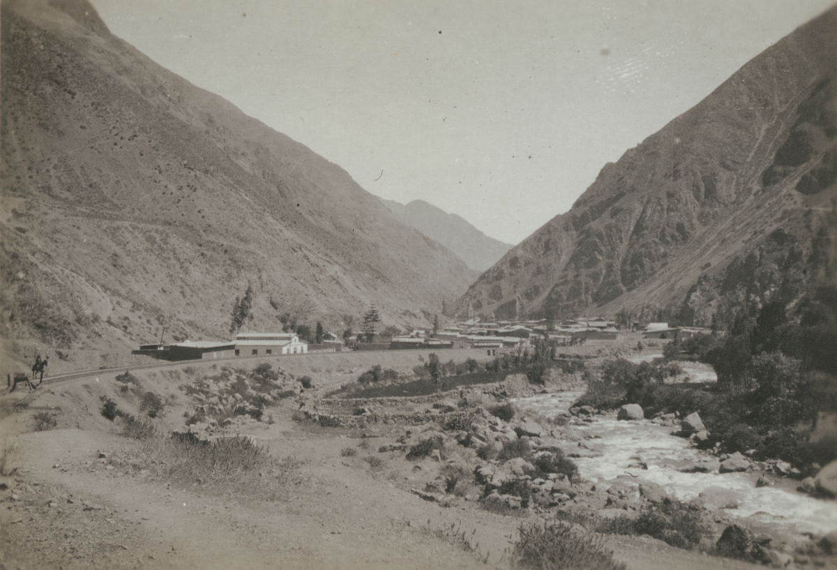 Fotografi från kuvert märkt med "Ernst Nordenskjöld". Vy över liten by belägen i ett bergslandskap.