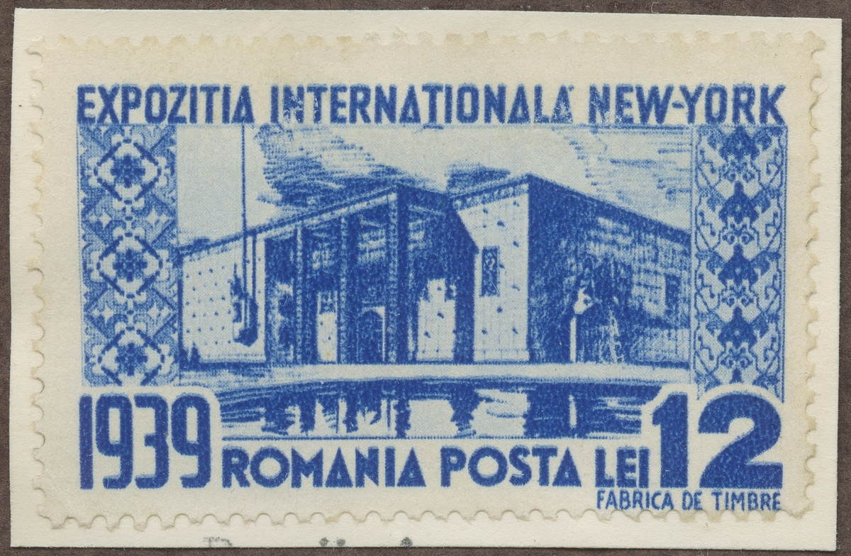 Frimärke från Rumänien, 1939. Motiv av Rumäniens utställningspaviljong i New York 1939