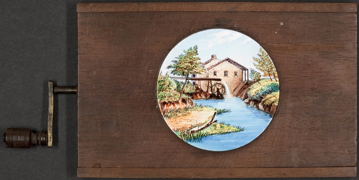 Ljusbild för laterna magica med motiv av kvarn, vattenhjul i rörelse.