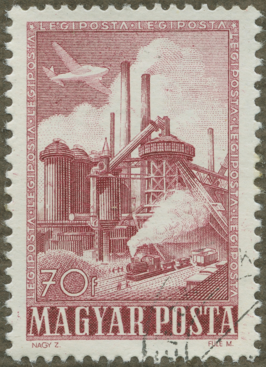 Frimärke ur Gösta Bodmans filatelistiska motivsamling, påbörjad 1950. Frimärke från Ungern, 1950. Motiv av Fabriksanläggningen Diosgyor. "-Monoplan. Luftpost.-"