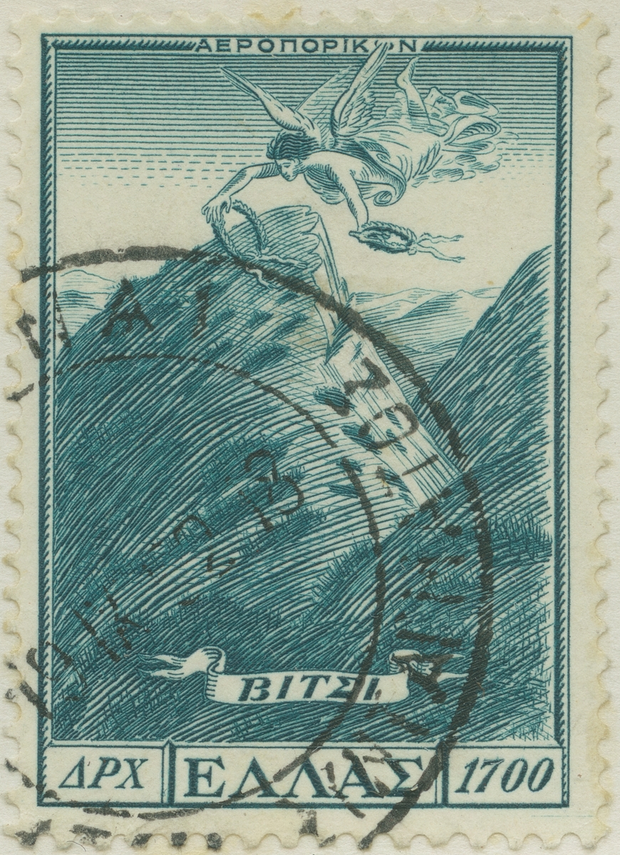 Frimärke ur Gösta Bodmans filatelistiska motivsamling, påbörjad 1950. Frimärke från Grekland, 1952. Motiv av Vitsi Berget "Symbol för grekiska folkets kamp mot kommunismen-"