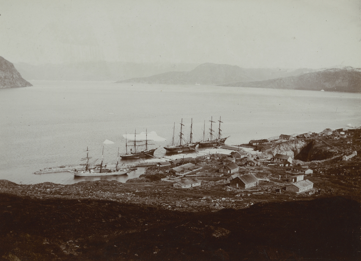 Fotografi från expedition till Grönland. Motiv av liten by vid kustlinjen. I havet vid stranden ligger fyra fiskebåtar.