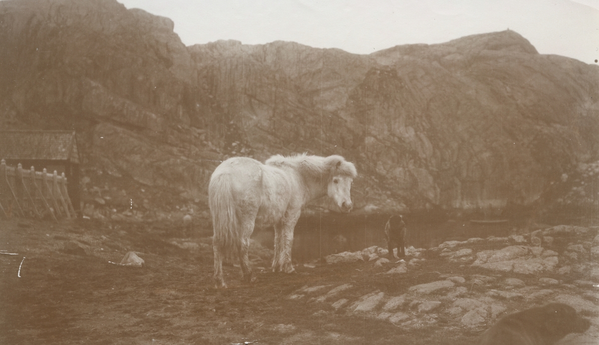 Fotografi från expedition till Grönland. Motiv av vit häst som står vid ett mindre berg. Bilden är tagen på ön Sukkertoppen som numera heter Maniitsoq. Ön ligger på Grönlands västkust och domineras av ett bergsmassiv med två toppar.