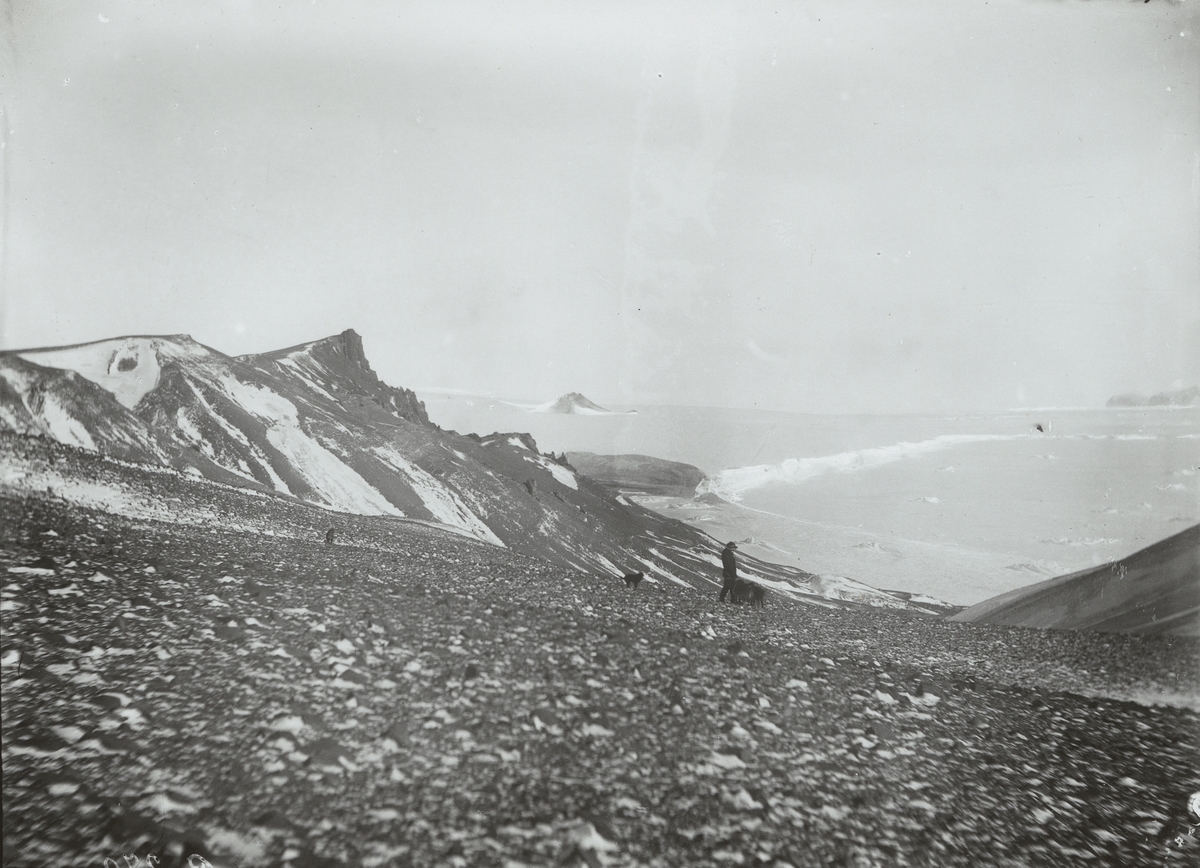Fotografi från första svenska Antarktisexpeditionen 1901-1904. Motiv av man med hund vid havet på Snow Hill.
