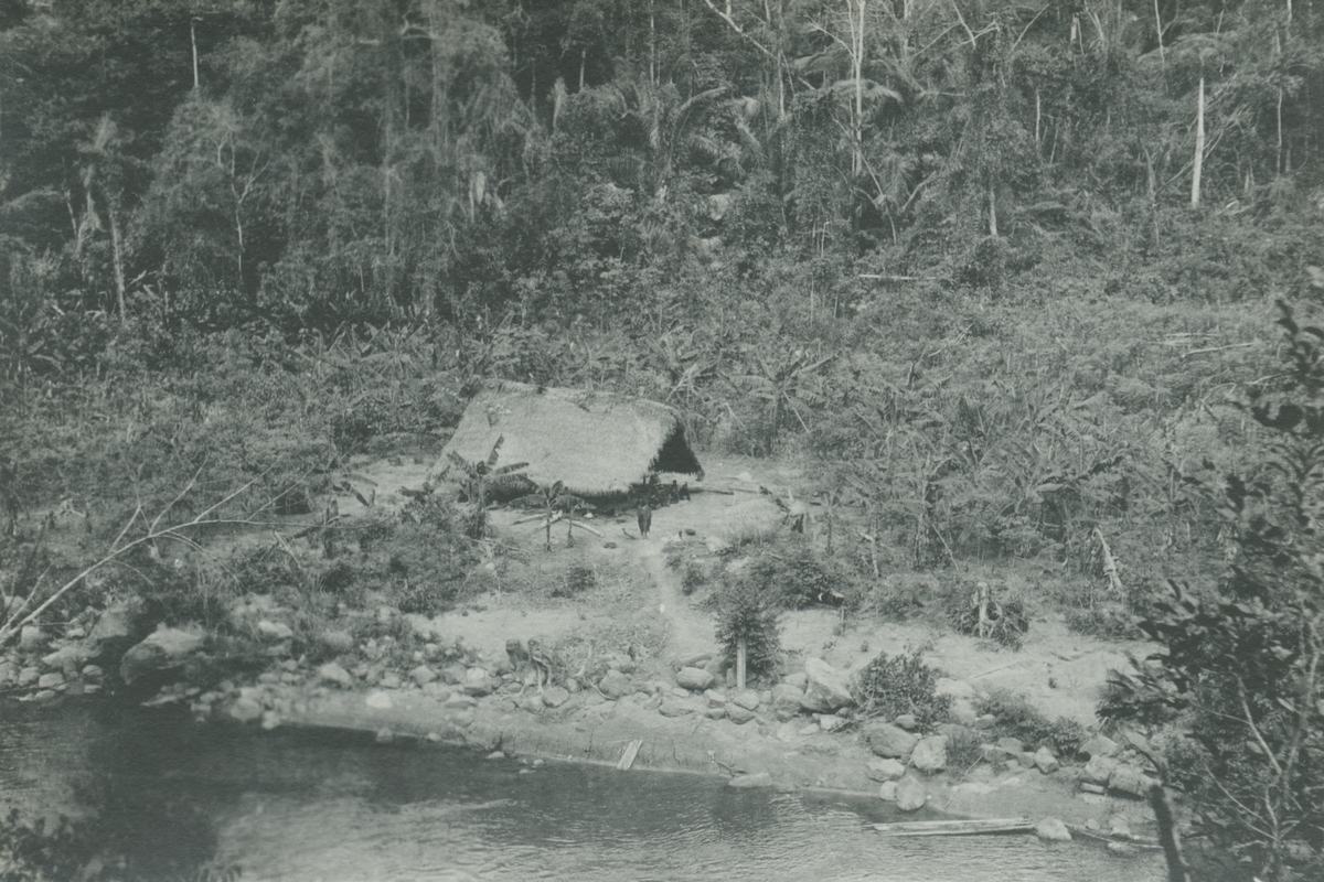 Fotografi från expedition till Peru 1920. Motiv av ensligt hus med halmtak som ligger vid flod i djungeln.