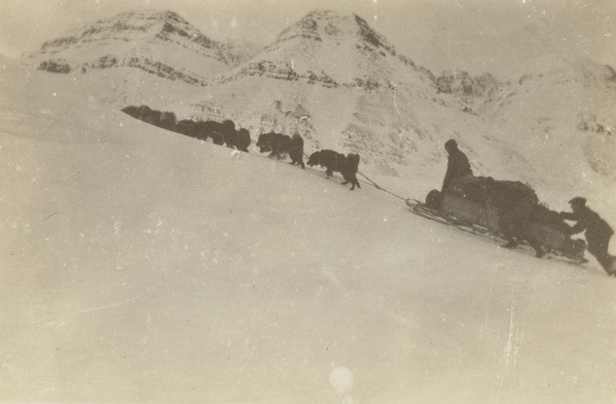 Fotografi från expedition till Spetsbergen. Motiv av ett hundspann och några människor som släpar en fullastad släde uppför en brant snötäckt backe.