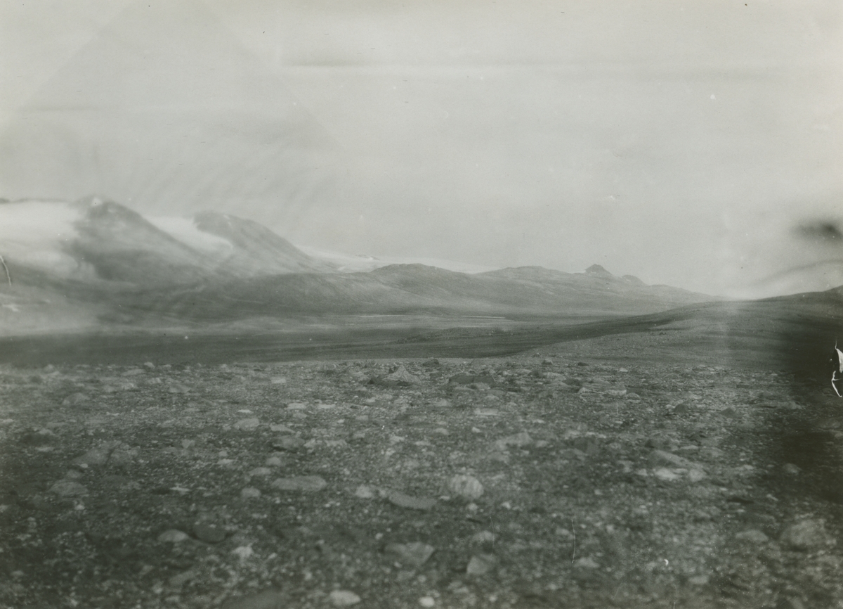 Fotografi från expedition till Östgrönland 1929. Dansk-svensk expedition under ledning av Lauge Koch. Svenska deltagare: Oscar Kulling och Helge Backlund. Vy över ett isigt bergslandskap.