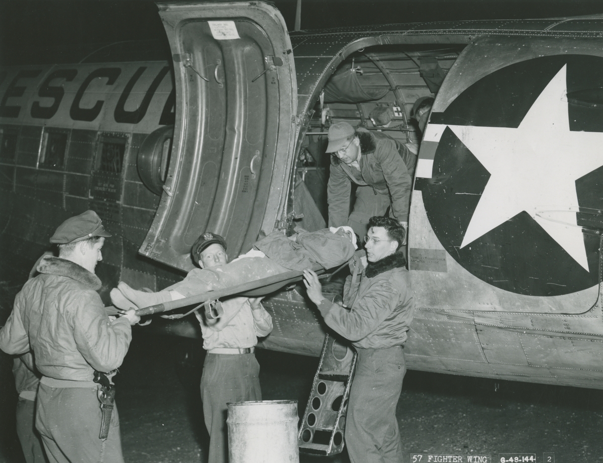 Fotografi från låda märkt Bernt Balchen. Balchen var norsk-amerikansk flygare, polarforskare och militär. Motiv av räddningsarbetare som bär ombord en skadad man på bår.