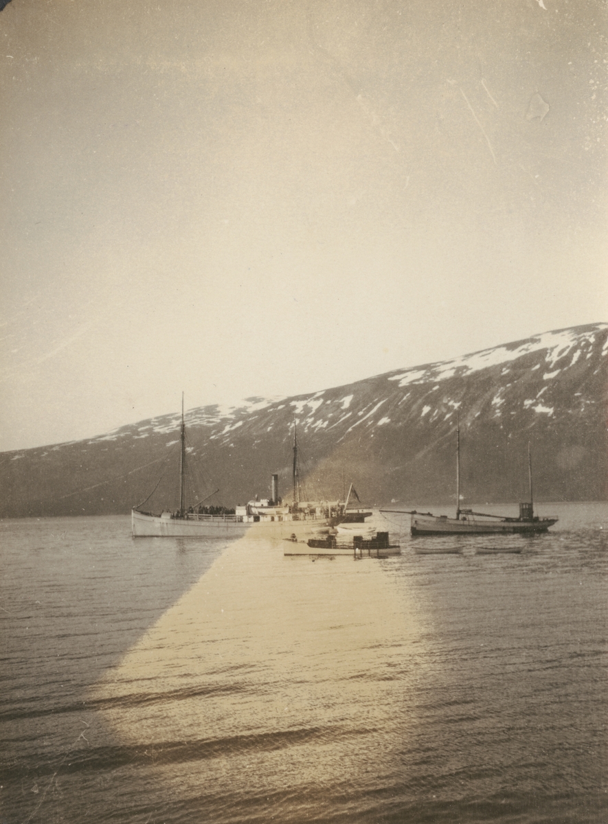Fotografi från expedition till Sveagruvan. Vy över hav, fartyg och snötäckt berg.
