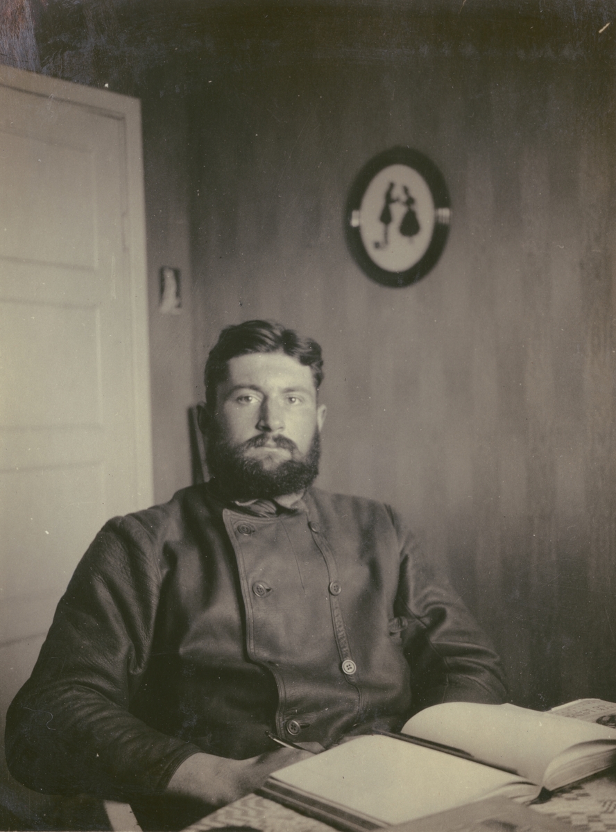 Fotografi från expedition till Sveagruvan. Porträtt av skäggig man som läser en bok inomhus.