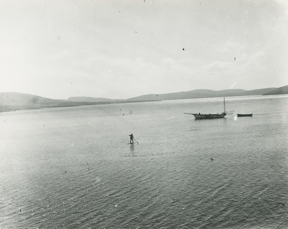 Bild från expedition i Antarktisområdet. Motiv av man i hav som tar sig till båt med hjälp av liten flotte och åra.