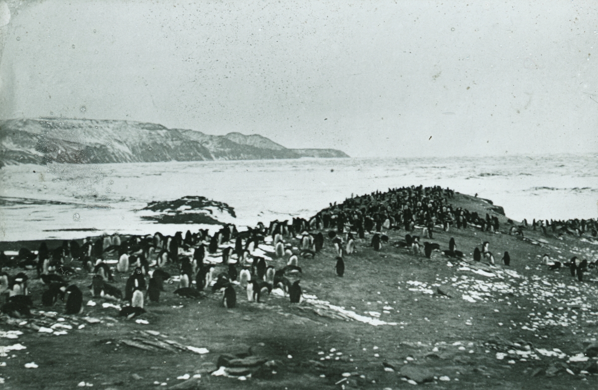 Fotografi från Grönland. Motiv av pingvinkoloni vid havet.