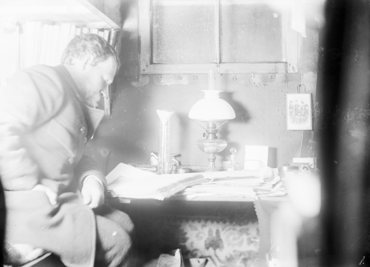Fotografi från undsättningsexpeditionen med fartyget Uruguay 1903. Motiv av man som läser bok inomhus.