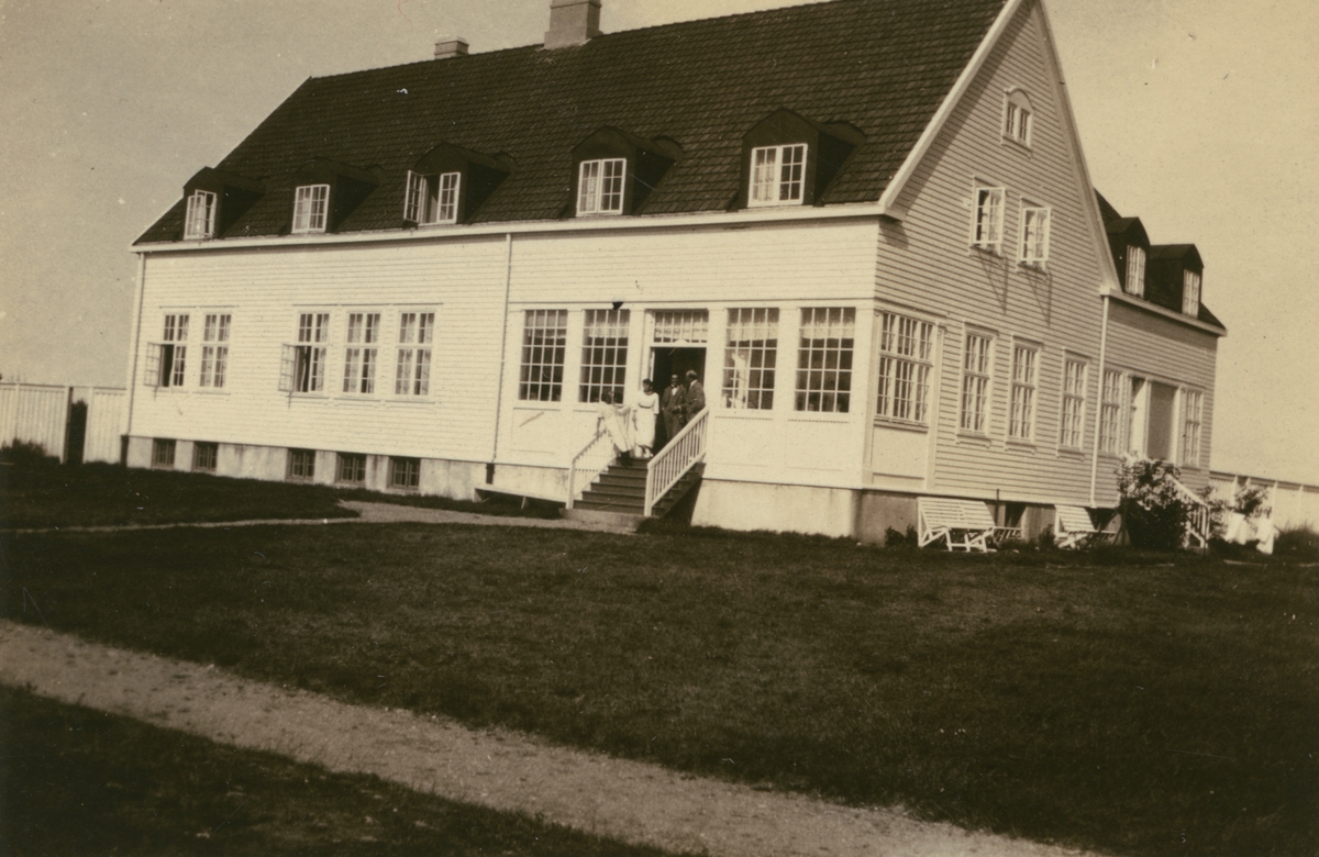 Fotografi från Albin Ahrenbergs resa till Grönland 1929. Motiv av stort hus.