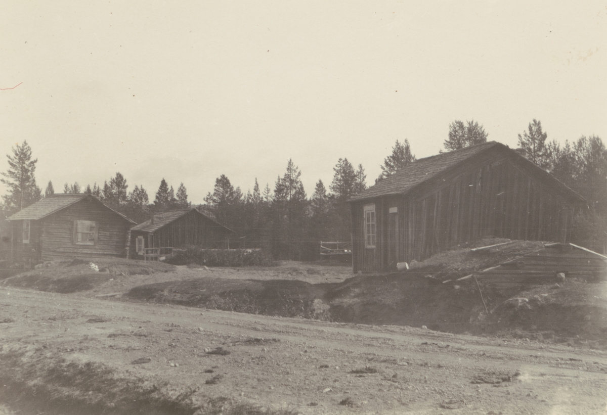 Fotografi från Albin Ahrenbergs resa till Grönland 1929. Motiv av hus, väg och träd på landsbygd.