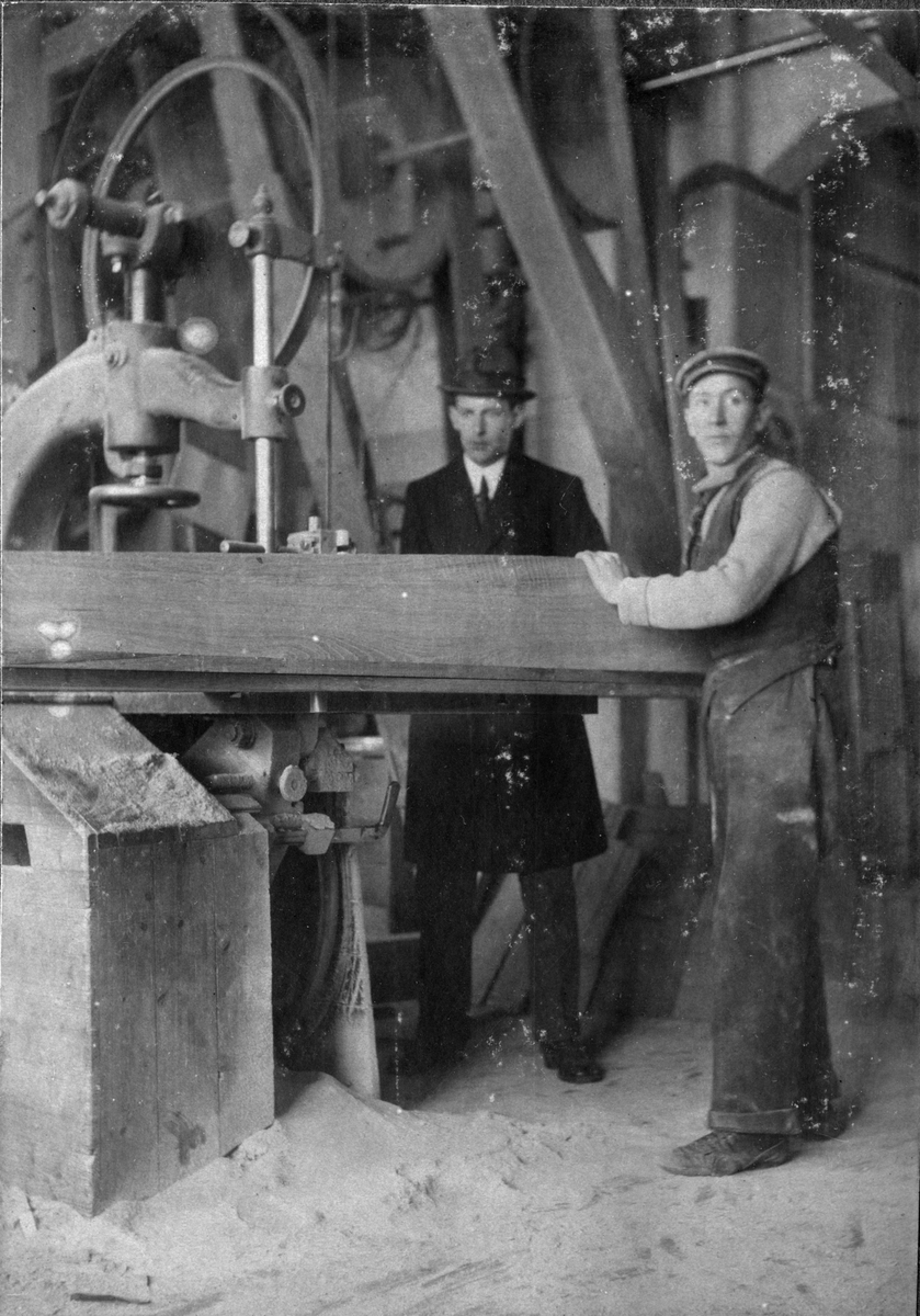 Fotografi ur album från Meisters-Flygaktiebolag i Göteborg. Okända män vid såg.