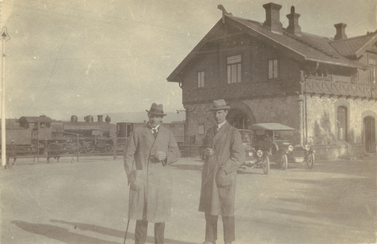 Fotografi från Albin Ahrenbergs resa till Grönland 1929. Motiv av två män som står framför hus, bilar och tåg.
