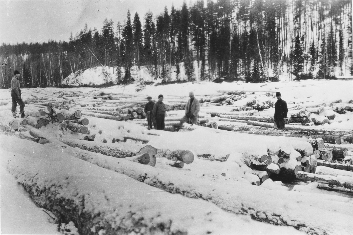 Kramfors aktiebolag. Timret tummas på vattendraget.