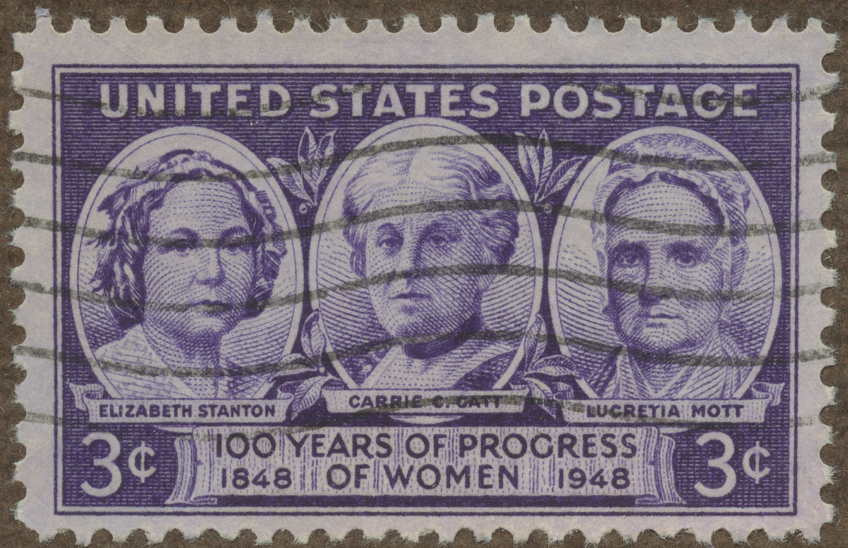 Frimärke från U.S.A., 1948. Motiv av Elisabeth Stanton Carrie C. Catt Lucretia Mott Kvinnosaksrörelsen pioniärer 100-årsminne 1848-1948.