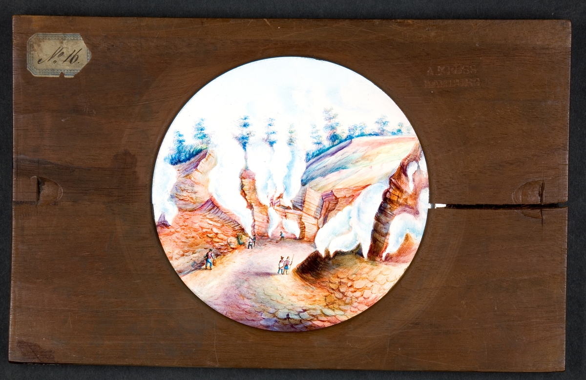 Laterna magica bild målad i färg på glasskiva.