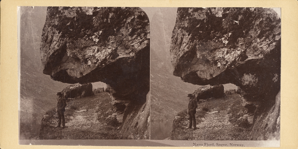 Stereobild av man på klippa, Naerofjorden.