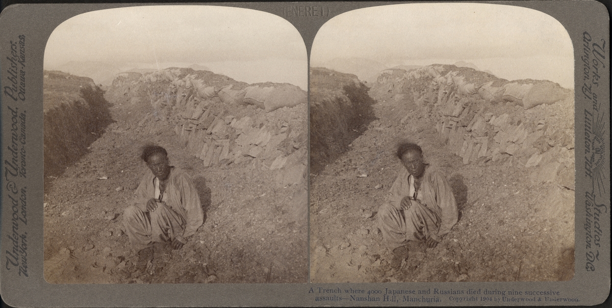 Stereobildav gammal man, sittande i de dike där 4000 Japaner och Ryssar förlorade sina liv under nio angrepp, Nanshan Hill, Manchuria.