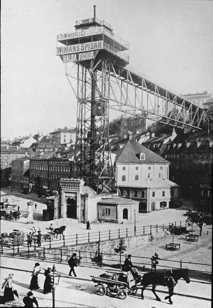 Titel: Bild, "Funktionalism" tillhörande samling av bilder med motiv av arkitektur, byggnader och hus, ritningar, design och mode. Katarinahissen, Slussen, Stockholm.