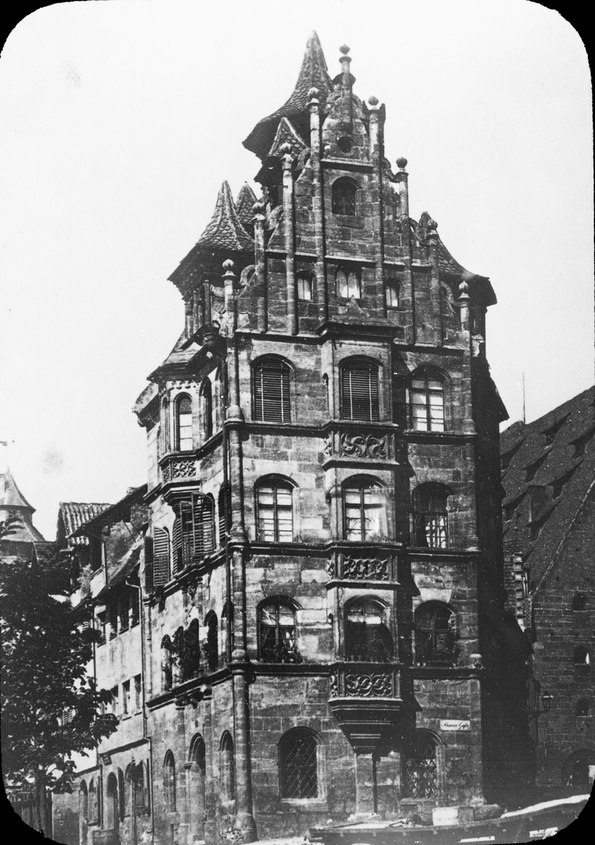 Skioptikonbild med motiv av äldre hus i Nürnberg.