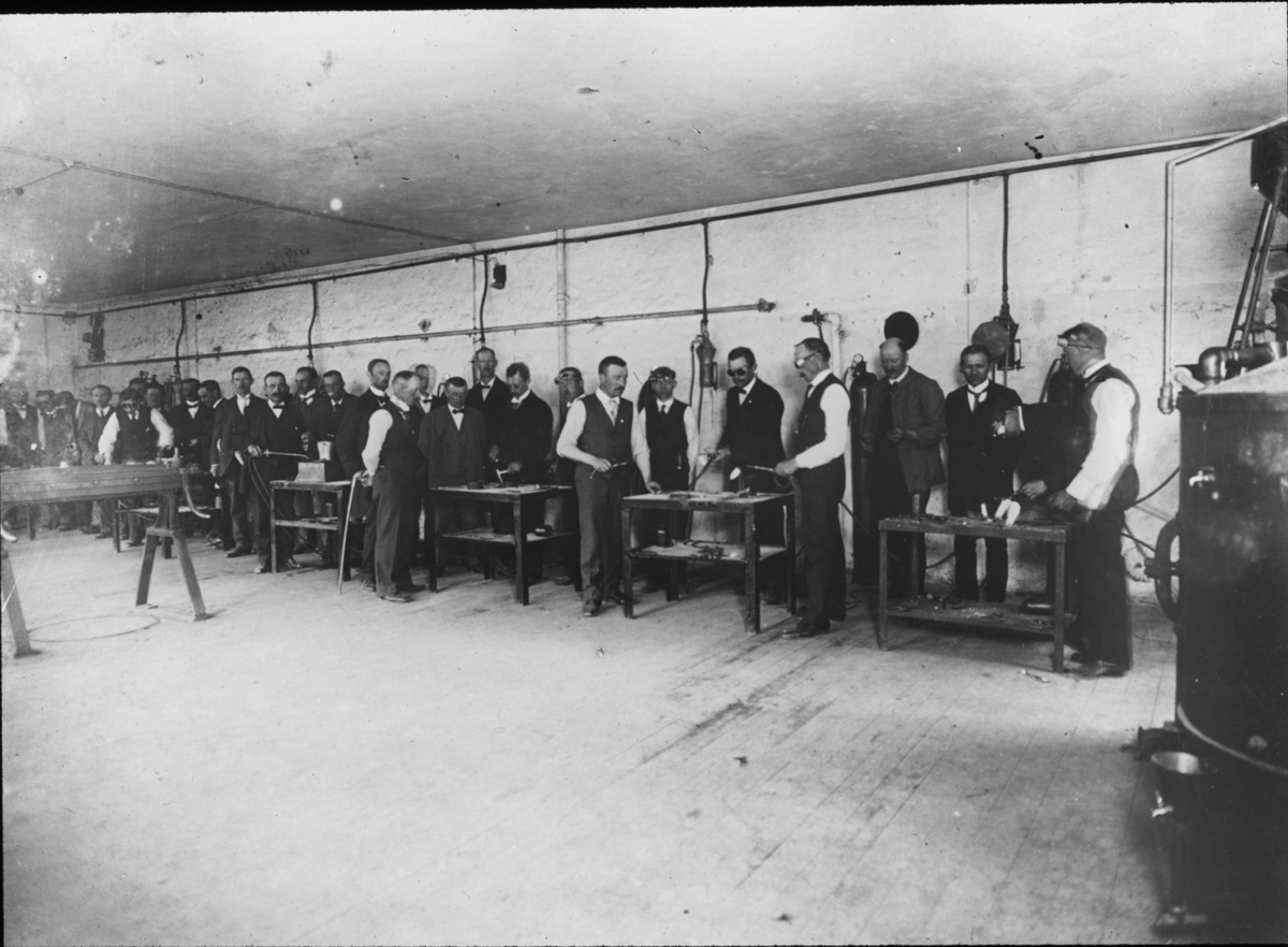 Gruppbild av män i verkstad, lärosal, smeder 1918.