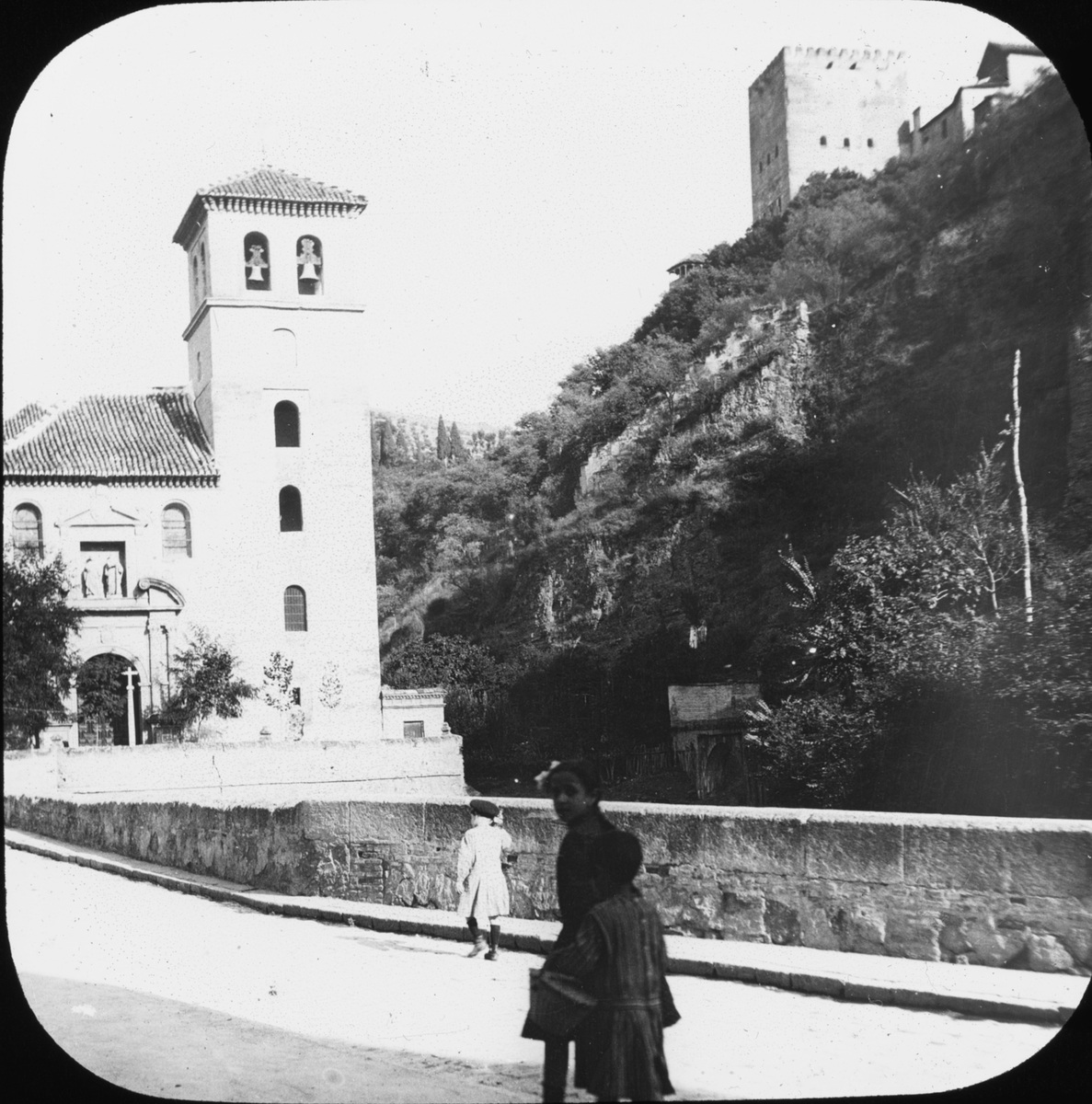 Skioptikonbild med motiv av barn på gata som leder till kyrkan St. Pedro, Granada.