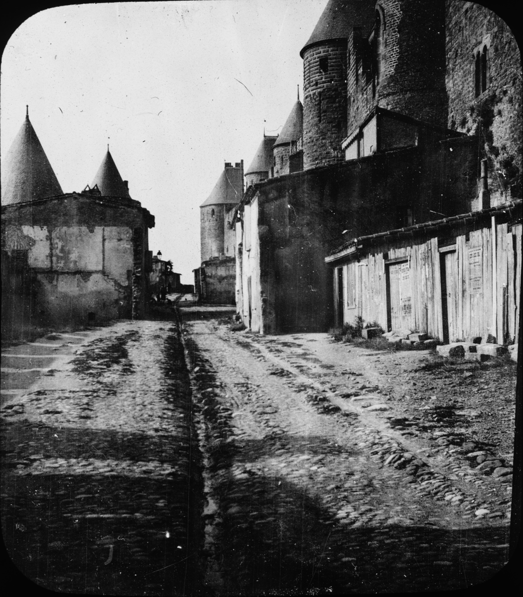 Skioptikonbild med motiv av väg vid medeltida borgen Cité de Carcassonne.