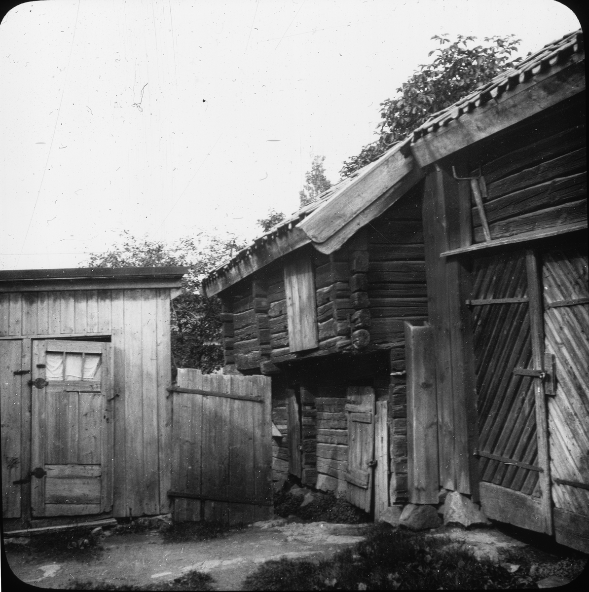 Skioptikonbild med motiv av timrat hus med svalgång i Strängnäs.