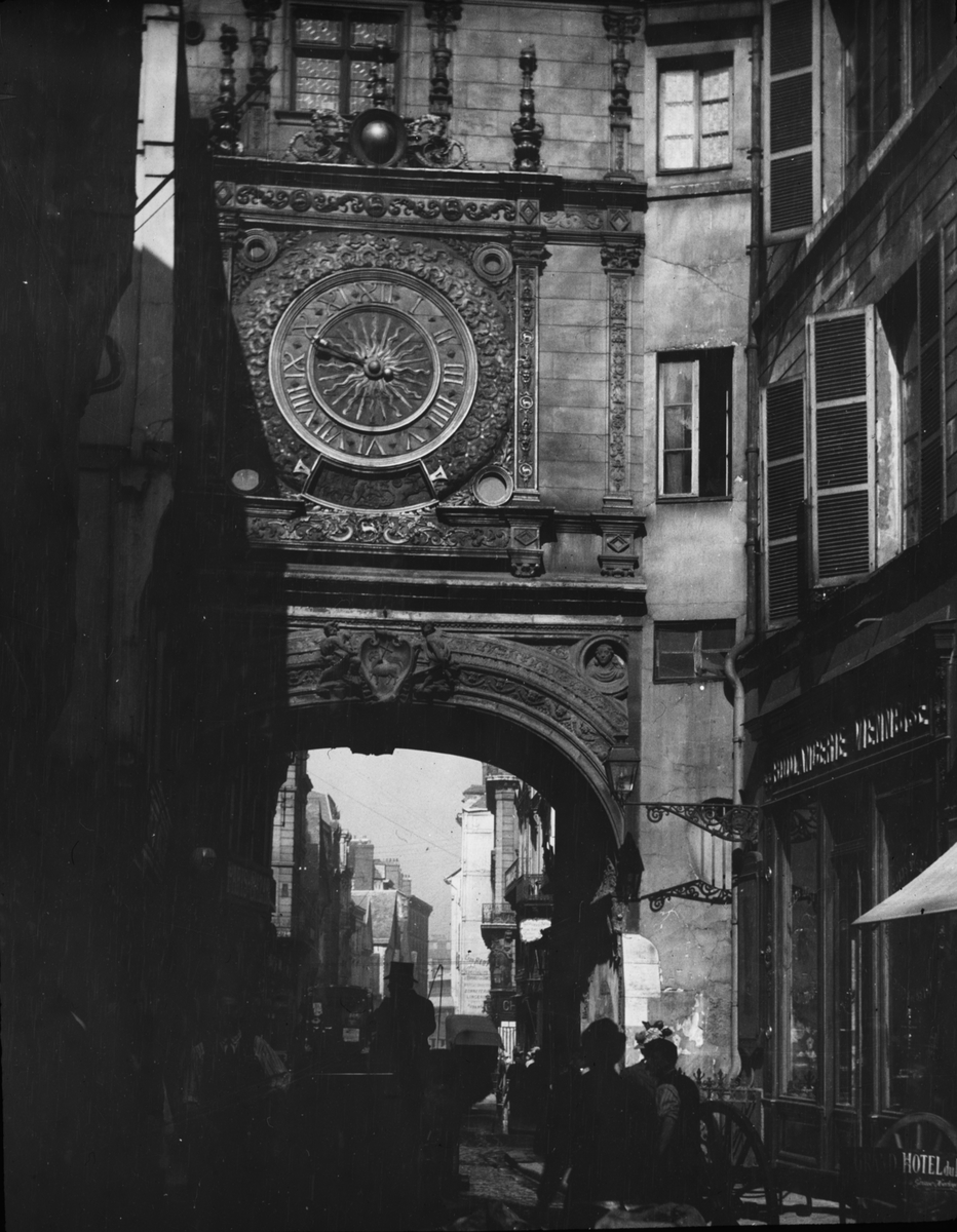 Bilden har förvarats i kartong märkt: Resan 1908. Rouen 7. VI. Text på bild: "La Grosse Horloge".
