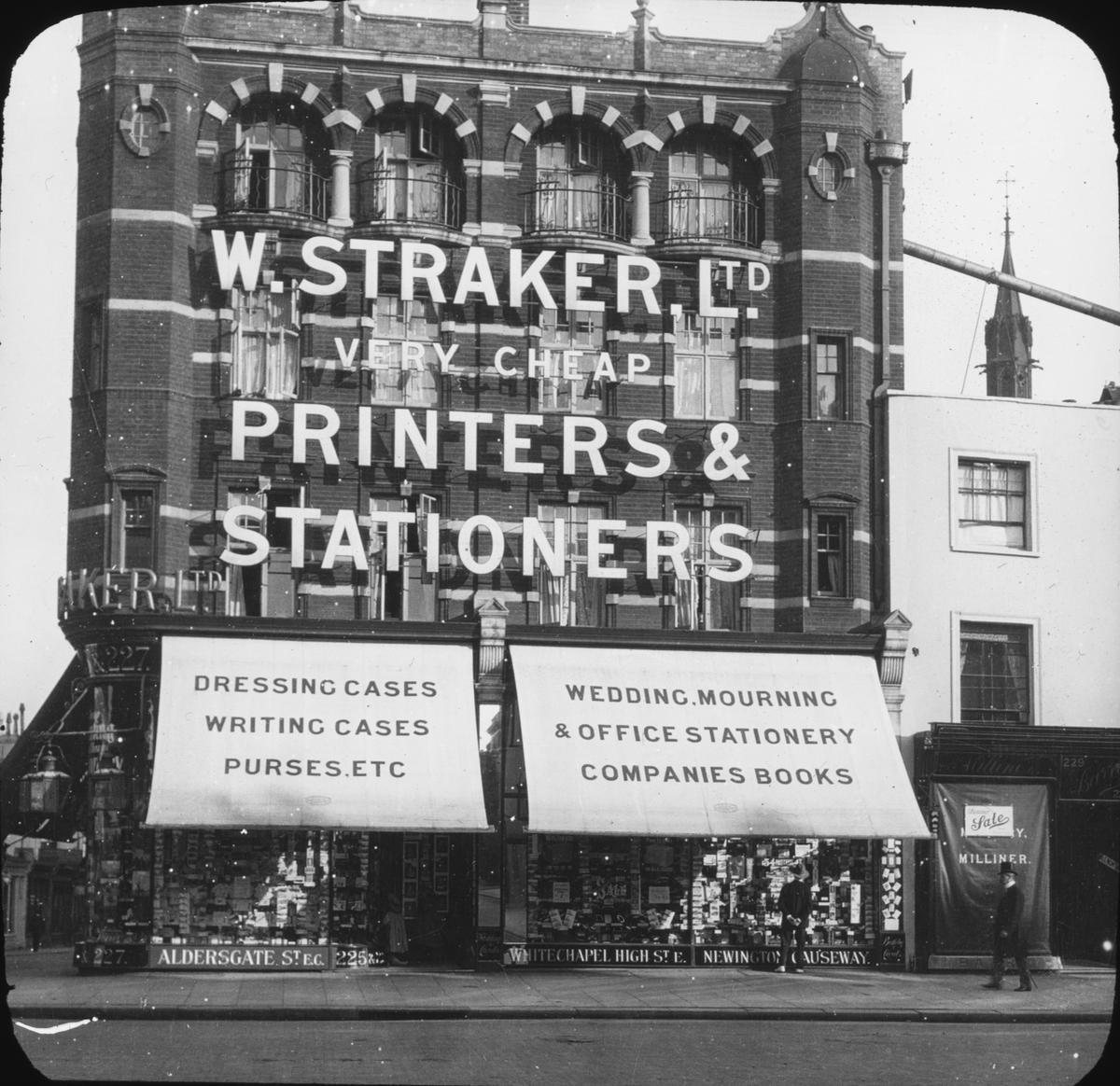 Skioptikonbild med motiv av bok- och kartongbutik längs Aldersgate street, London.